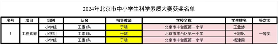 喜报 北京市丰台区第一小学“工素1队”斩获北京市中小学生科学素质大赛一等奖!