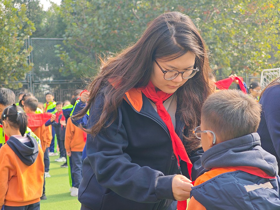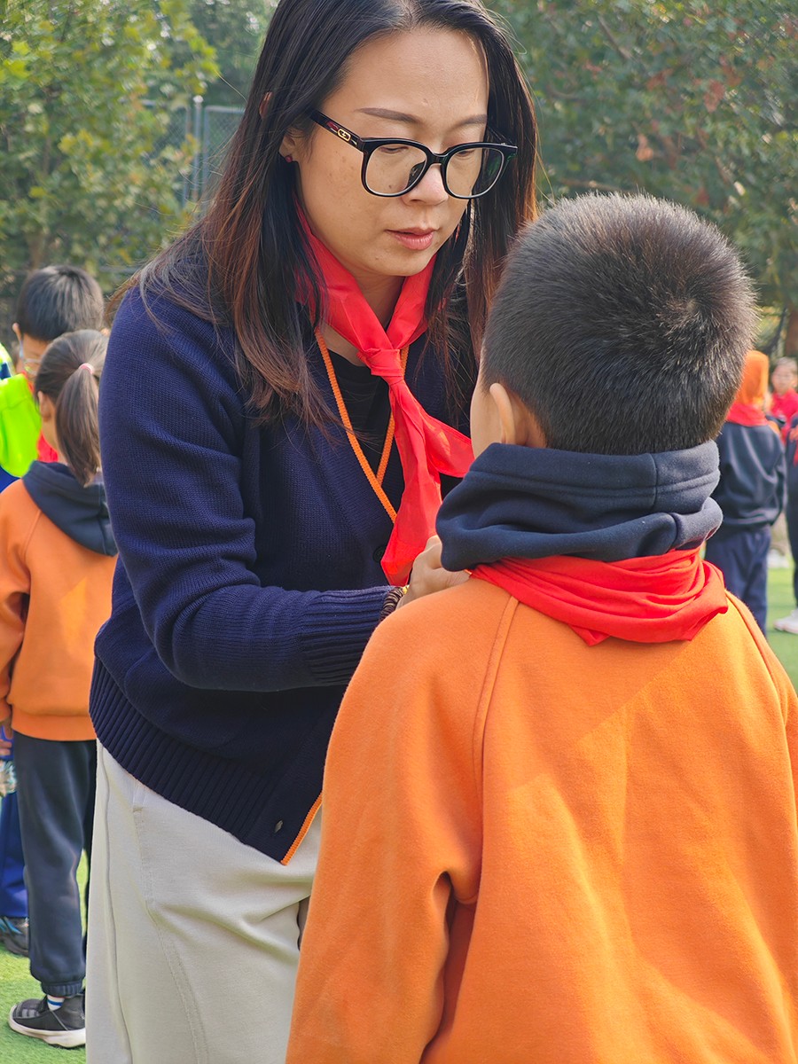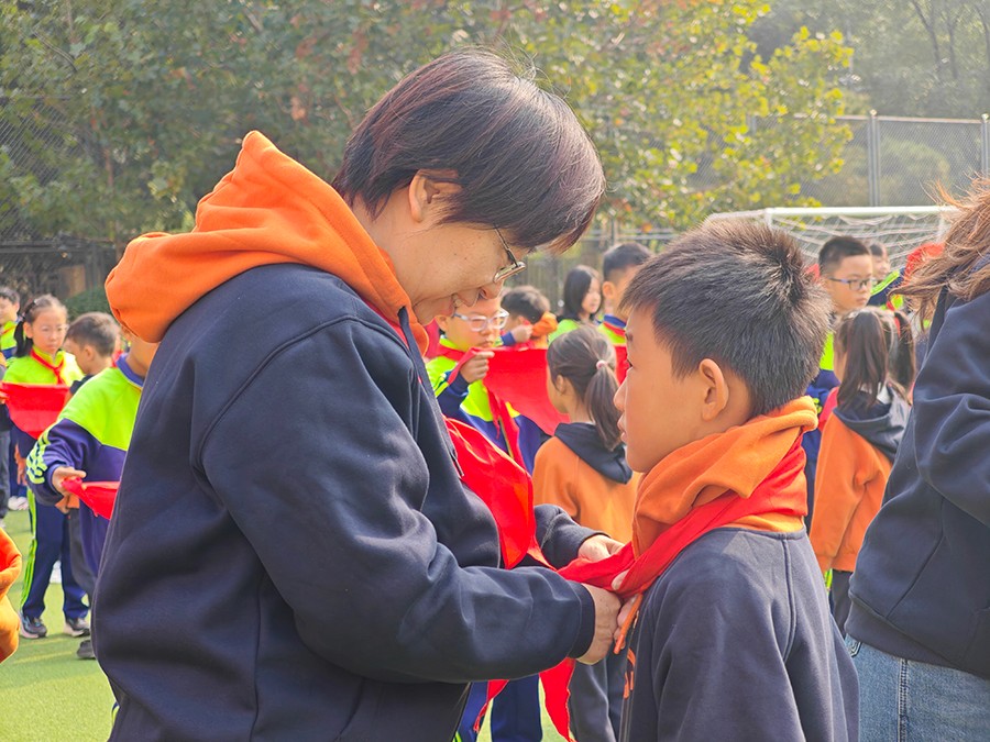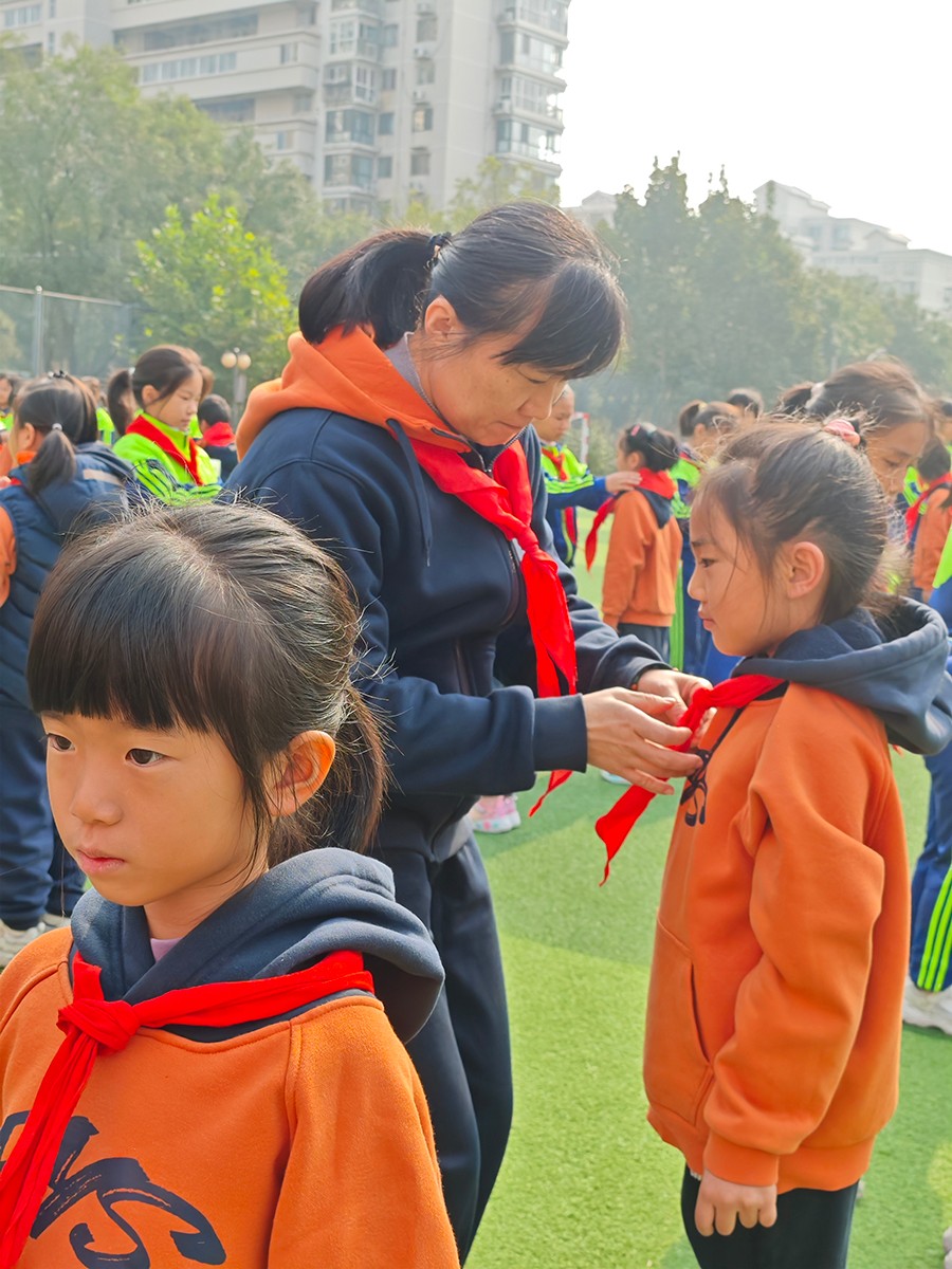 在温馨的背景音乐中,教师代表和五年级队员代表为新队员佩戴上鲜艳的红领巾。一条条红领巾,象征着荣誉,更承载着责任与希望。