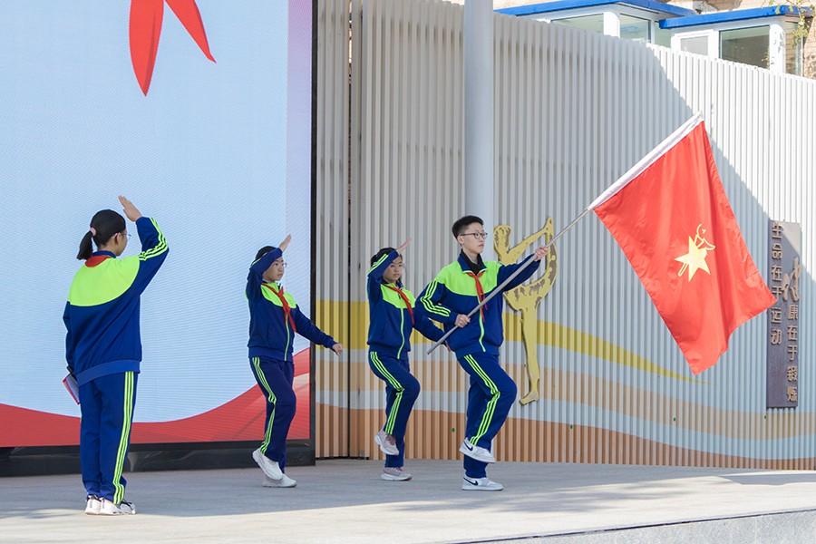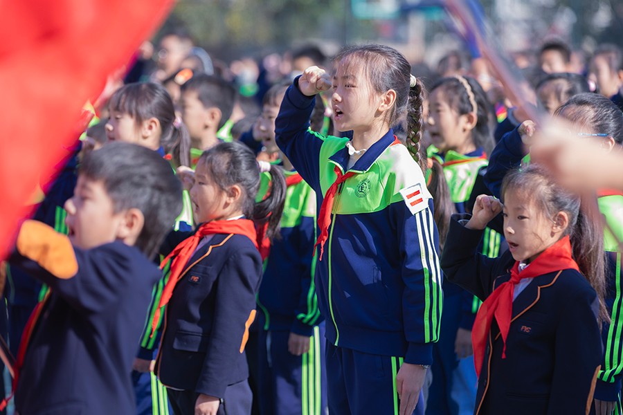 代校长带领全体队员呼号,“时刻准备着”——洪亮且坚定的回答,不仅是对少先队组织的庄严承诺,更是他们树立理想、砥砺前行的精神号角。