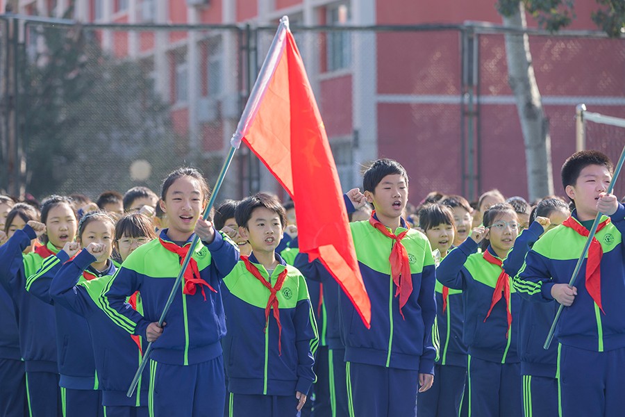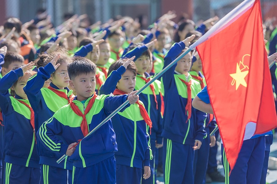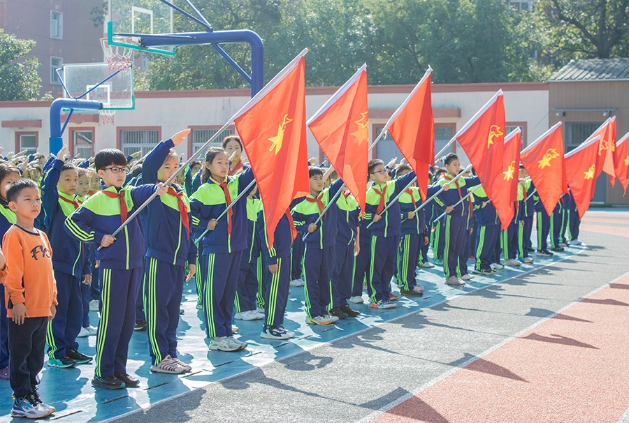 旗帜下,代校长带领全体队员呼号,“时刻准备着!”响亮的誓言在校园上空回荡,这誓言表达着少先队员对党的庄严承诺和立志成为祖国未来接班人的坚定决心。