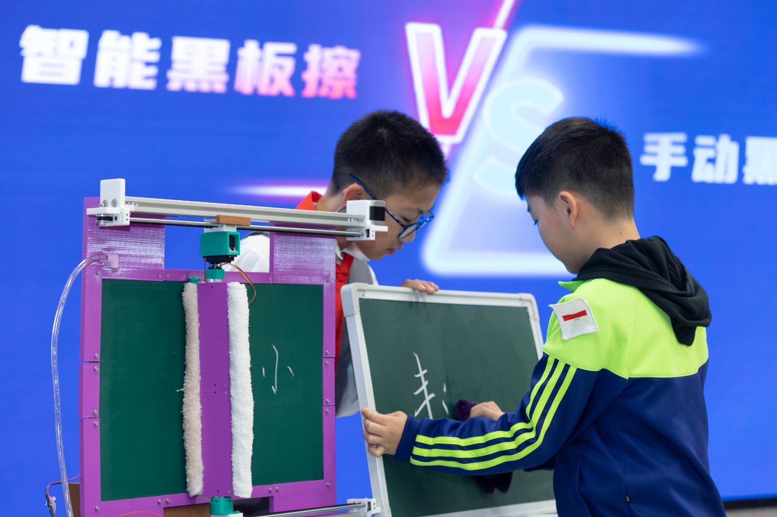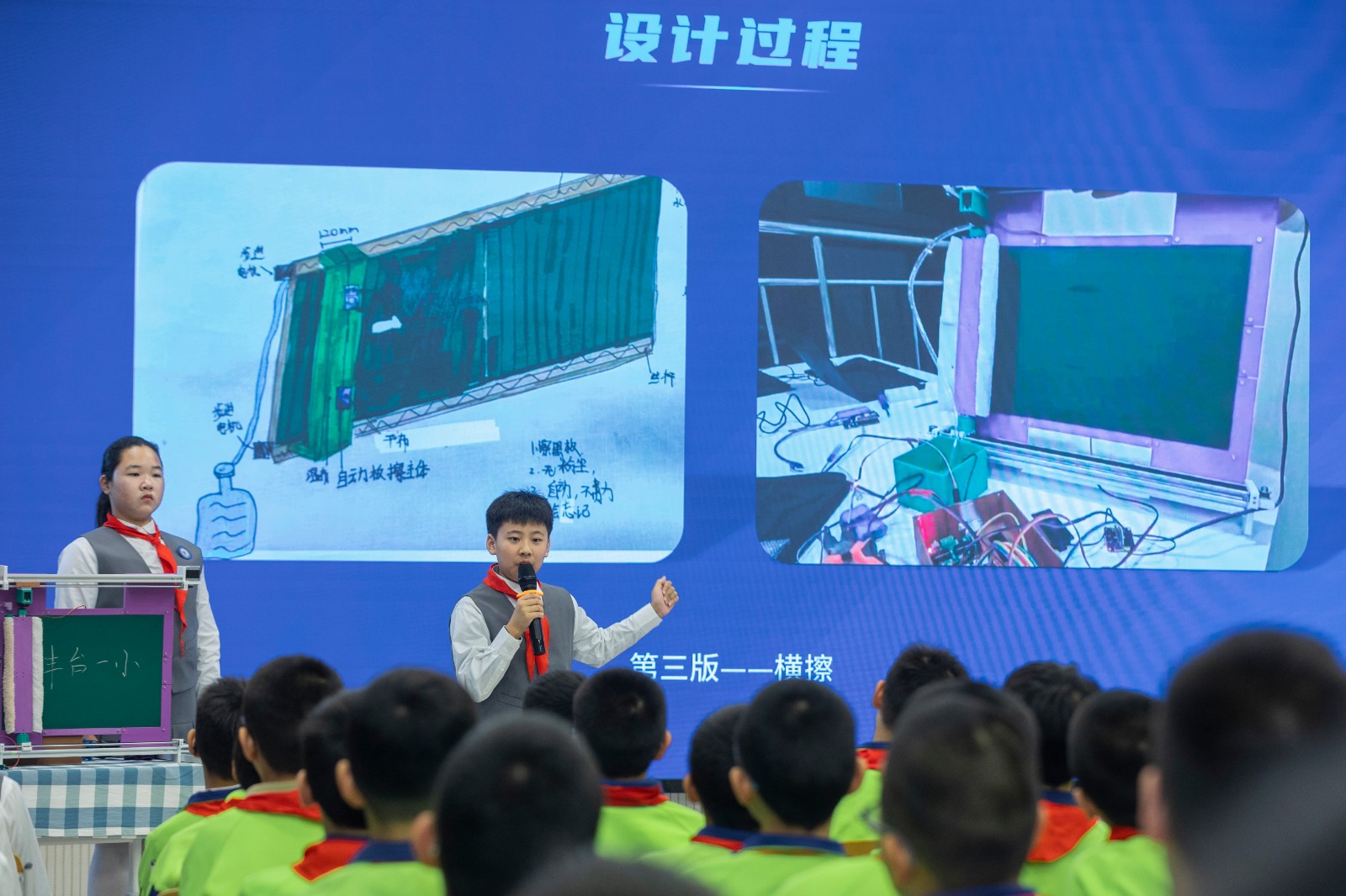 你是否曾注意到,每次课间擦黑板的繁琐?六2班的同学们不仅发现了这一问题,更发明了智能黑板擦来解决它。在活动现场,智能黑板擦与手动黑板擦的PK中,智能黑板擦以速度和清洁度的优势胜出。它支持语音操作,能够实现半块黑板的精准擦拭,让日常的清洁工作变得简单而高效。