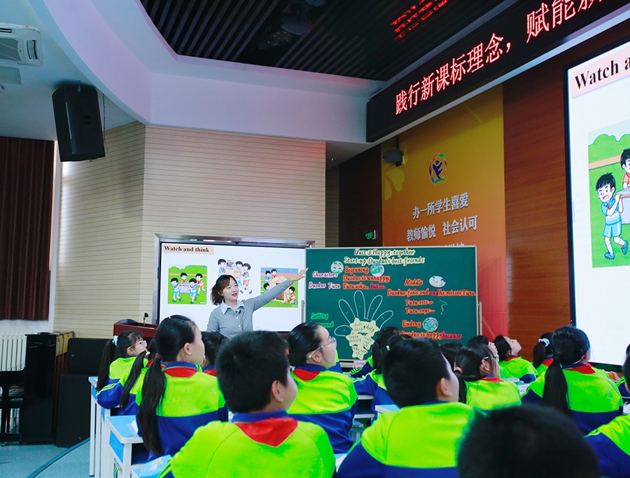 首先,丰台区第一小学的王旭老师带来了一堂寓教于乐的展示课:外研新标准五上第三单元Happy together Start up《Duoduo’s best friends》。课前,学生在欢快的歌声中,自由选择与好友共度本课时光。课上,王旭老师以生动的配图故事为载体,并融合多种AI技术,让学生在提高语言能力与学习能力的同时,收获了珍贵的成长感悟。并通过故事教学,传递出 “倾听、互助、分享” 是化解朋友间矛盾的关键这一理念,兼具现实意义与教育价值。学生在好友共同参与活动,共同学习,互帮互助,分享成果的过程中,体会到了与好朋友在一起的快乐。这堂课,不仅践行了新课标理念,以新教材故事为载体,聚焦英语素养培养;还通过多种活动让学生学知识、练表达,引导学生悟友谊之道,将语言学习与情感、社交素养结合,是素养导向课堂教学实践的生动体现。