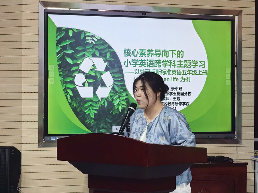 在微课展示环节中,来自人大附小京西分校的陈仲琳老师和北京第二实验小学玉桃园分校的景小双老师,分别带来新标准四上 Unit 2《Helping at home》和的五上Unit2《A green life》的课时微课展示。陈仲琳老师融入了 AI 动画、学生表演与读者剧场元素,并佩戴头饰示范引导学生运用语言的过程,与台下教师互动表演,生动诠释素养导向教学;景小双老师不仅深入挖掘课本中的内容,更延伸解读了背后的意义,并简要讲解倡议书结构,为新教材教学提供了实用参考。
