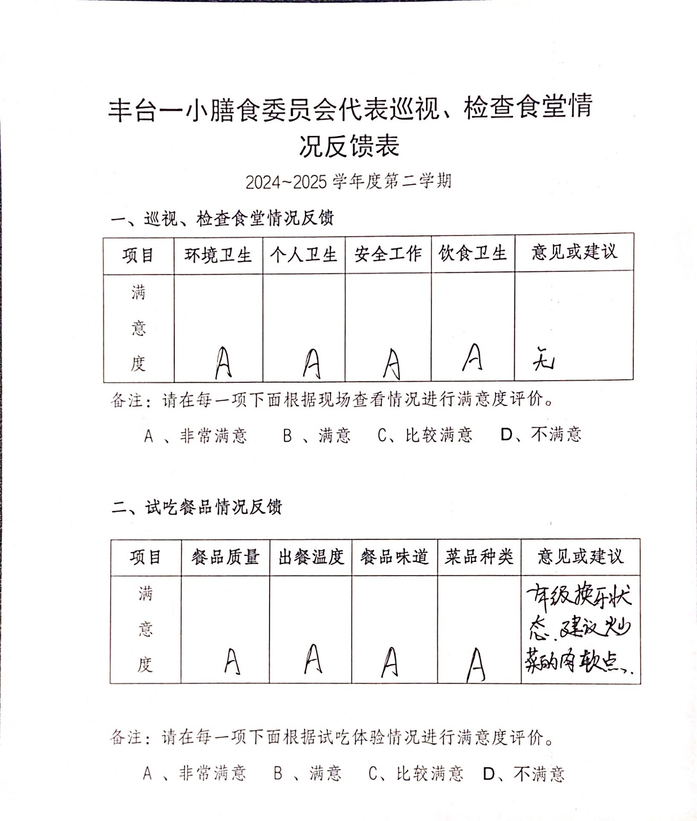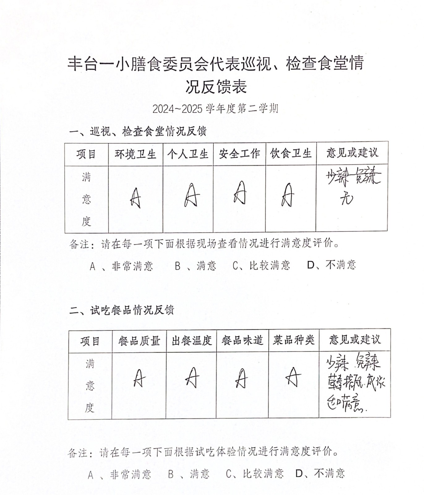 看着孩子们大口朵颐,脸上满是满足,家长们倍感欣慰。用餐后,家长和学生代表认真填写陪餐记录表与评价反馈表。“很好吃!”“我喜欢吃今天的鱼香肉丝!” 孩子们餐后兴奋地分享。家长们也踊跃发言,肯定餐品色香味俱佳、营养搭配合理,同时也提出了不少实用建议,如增加汤品的种类、根据季节变化调整菜品、改进餐盘的保温设计等。