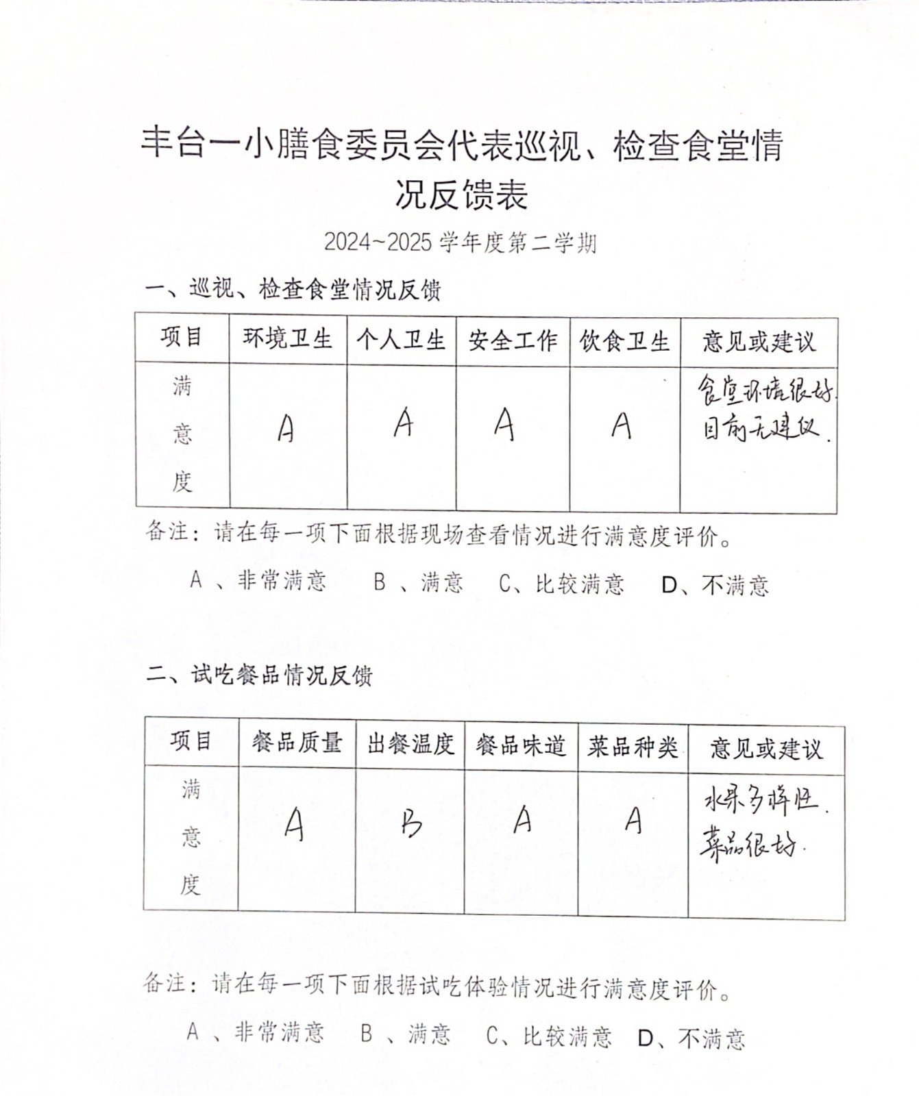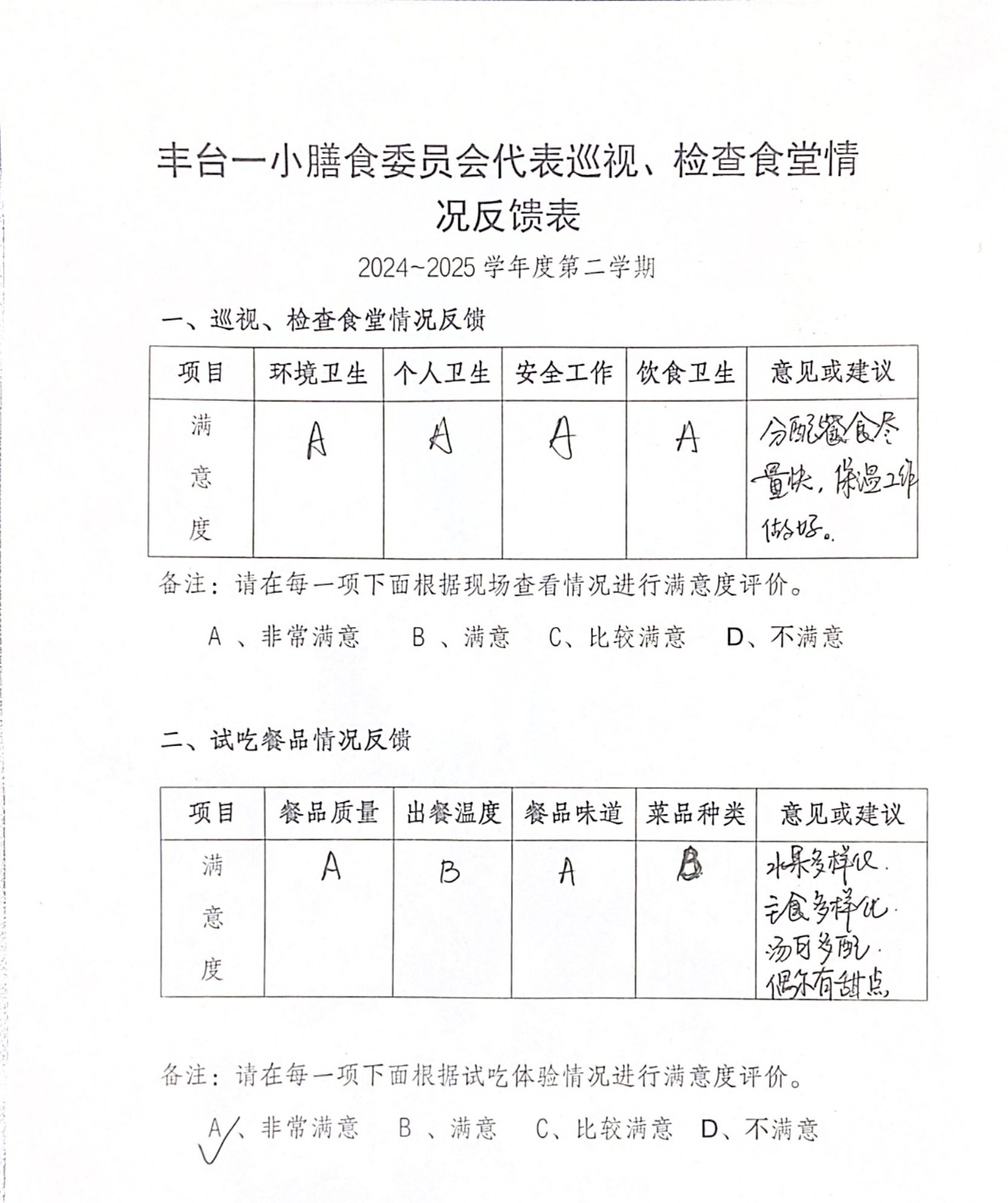 为守护学生饮食健康,提升校园餐食品质,促进家校紧密合作,丰台区第一小学于 2025 年 2 月 19 日、20 日分别在丰益校区和本校区开展 “美好‘食’光” 专项工作会,膳食委员会委员与家委会代表纷纷走进校园,深入了解学生的饮食情况。