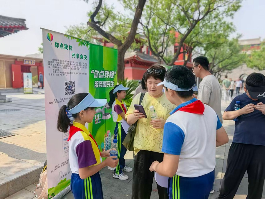 在中秋、国庆双节即将到来之际,丰台一小“食安小卫士”们与丰台区市场监管局的叔叔阿姨一起,将“你点我检 服务惠民生”活动搬进宛平城,用实际行动为筑牢食品安全防线贡献力量。