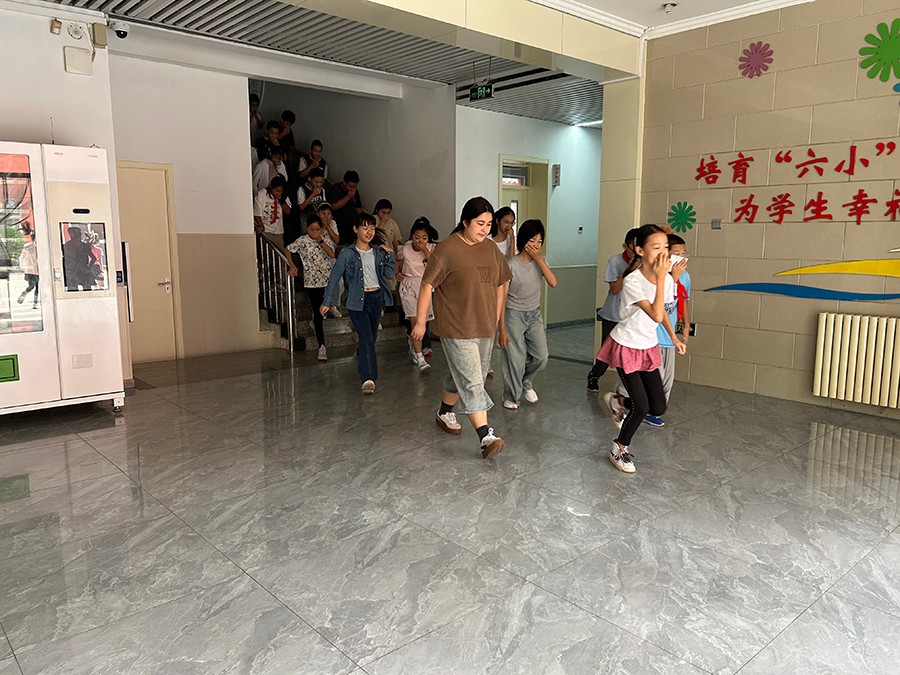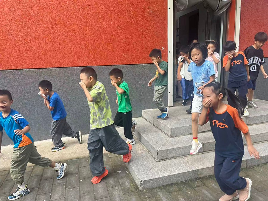 各班老师迅速组织同学们捂住口鼻、弯腰低姿,沿着安全通道有序撤离。孩子们神情专注,动作规范,短短几分钟内,全体师生已安全抵达指定集合点,整个过程紧张有序。